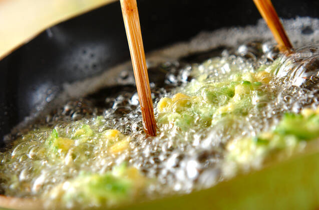 少量ずつ油に落としてサックリ揚げ、油切りをして器に盛り、塩を振り掛ける。