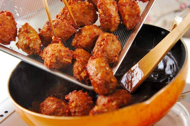 中華鍋に(揚げていた鍋でOKです)<甘酢あん>を入れる。強火にかけて木ベラで手早く混ぜ、トロミがついてきたら肉団子を戻し入れて全体にからめ、器に盛る。