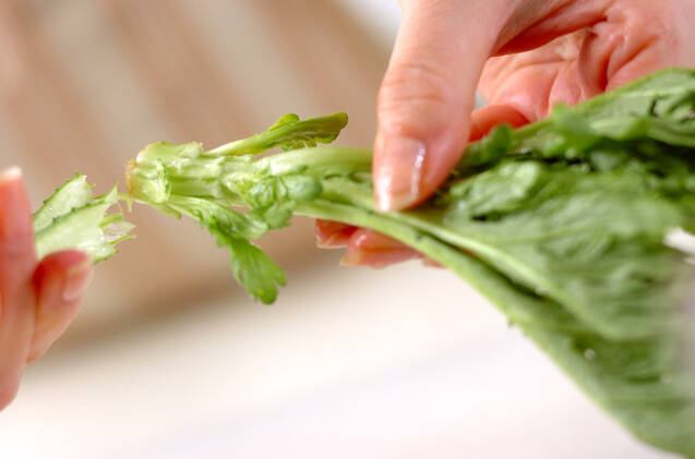 菊菜は1枚ずつ葉を摘み取り、水洗いして4cmの長さに切る。
