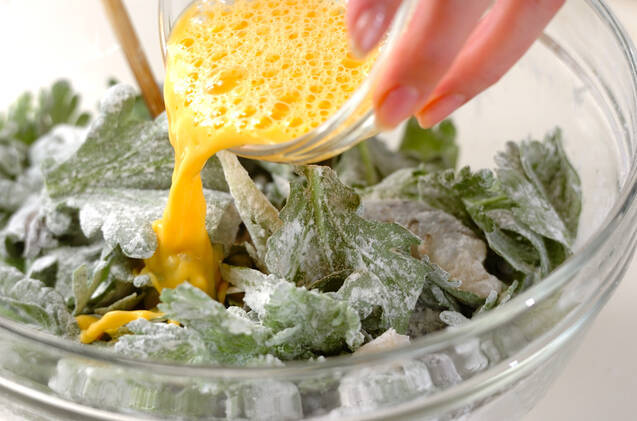 ボウルに菊菜、むきエビ、小麦粉、片栗粉を加えて混ぜ合わせる。卵水を加えながら混ぜ、全体にまとめる。