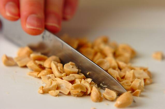 ピーナッツは粗みじん切りにして<調味料>の材料と混ぜ合わせ、(2)にかける。