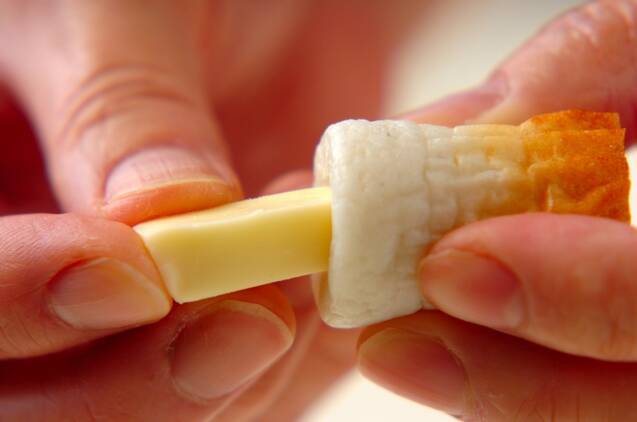 ちくわは長さを3等分に切る。プロセスチーズは、ちくわの穴に入るくらいの大きさに切り、穴に差し込む。