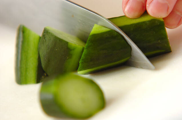 キュウリは端を切り落とし、ピーラーなどで縦じまに皮をむき、ひとくち大の乱切りにする。
