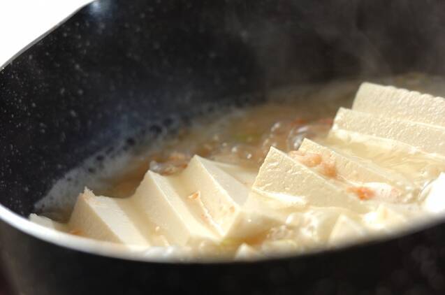 小鍋にサラダ油を温め、白ネギ(白い部分)とショウガを弱火で炒める。香りが出てきたら<スープ>の材料、絹ごし豆腐、カニ缶を加え、煮たったら弱火で2~3分煮る。