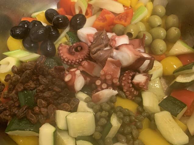 (4)のナスはじっくり5分ほどかけてしっかりと焦げ目をつける。その間に隣の鍋の野菜に程よく火が入ったら、タコ、オリーブの実、ケイパー、アンチョビ、オレガノ、白ワインで戻したレーズンを入れる。