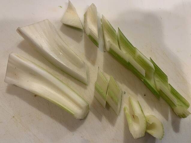 セロリは両側のエッジと真ん中あたりの筋をピーラーでむき、斜め2cm幅に切る。