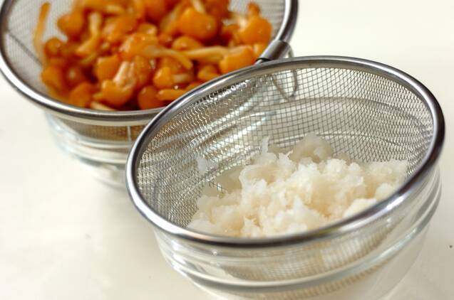 ナメコはサッと水洗いし、ザルに上げる。大根おろしはザルに上げて軽く押さえ、汁気をきる。