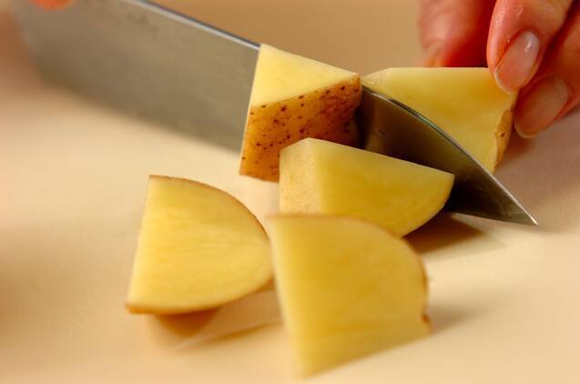 ジャガイモは皮付きのまま乱切りにする。グリンピースを鞘から取り出し軽く水洗いする。紫玉ネギは薄切りにし、水にさらして水気をきる。