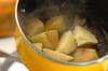鍋にお湯を沸かして塩を加え、グリンピースを3分ゆでる。ジャガイモは水からゆでる。柔らかくなったらお湯を捨て、再び中火にかけ、残った水分を蒸発させる。