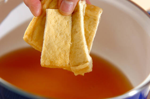 鍋にだし汁を入れて強火にかけ、煮たったら<調味料>の材料を加え、再び煮たったら油揚げを加える。