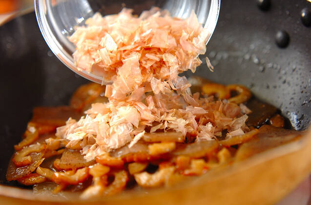 かつお節をからめて器に盛り、刻みネギ、白ゴマを散らす。