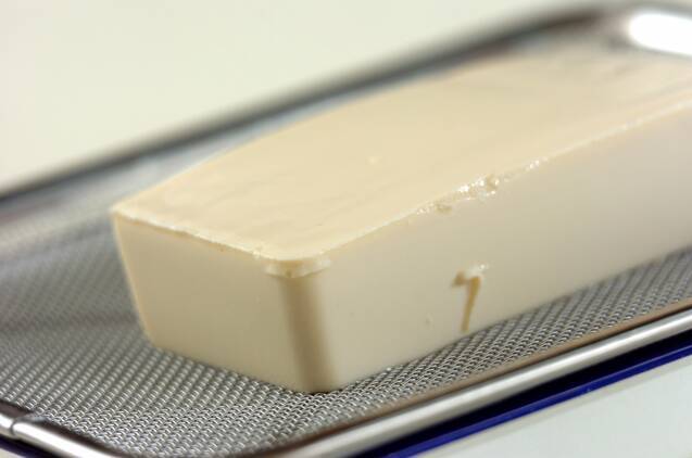 絹ごし豆腐は、ザルに上げて水をきっておく。