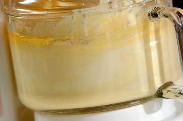 フードプロセッサーに絹ごし豆腐、卵黄、クリームチーズを入れ、なめらかになるまでかくはんする。大きめのボウルに移し替える。