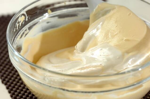(1)のボウルに(2)を数回に分けて加え、そのつどゴムベラで下からすくい上げるようにやさしくムラがないように混ぜる。バニラオイルも加え混ぜる。
