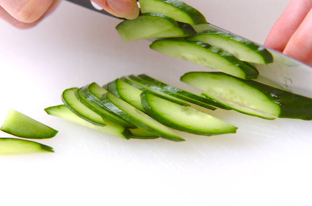 キュウリは両端を切り落として縦半分に切り、斜め薄切りにする。塩少々を混ぜて水分が出たら、サッと水で洗ってぎゅっと絞る。