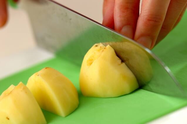 ジャガイモは皮をむき、4~8つに切って水に放つ。