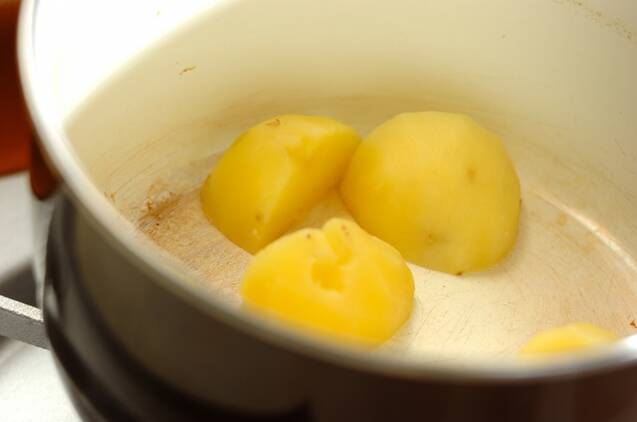 串がスッと刺さる位の柔らかさになったらゆで汁を捨て、再び火にかけて水分を飛ばす。