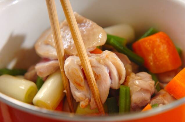 鍋にサラダ油を熱し、鶏もも肉を中火で炒める。表面が白く火が通ったら、白ネギ、ニンジン、サヤインゲンを加えて、全体に油がまわるまで炒める。
