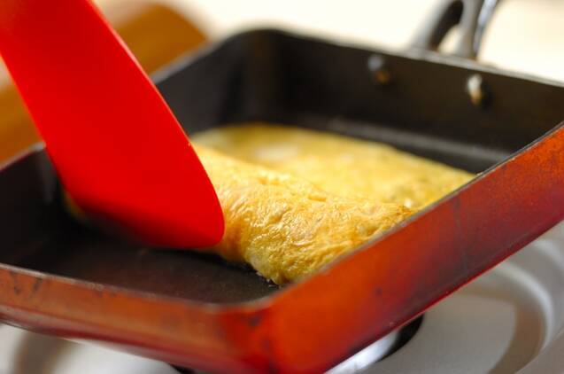 卵焼き器に薄くサラダ油をひき、中火で熱する。<卵液>を薄く流し入れて、手前に巻く。奥に寄せる。