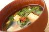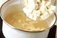 鍋にだし汁を入れて強火にかけ、煮立てば油揚げを加え、再び煮立てば豆腐を加える。