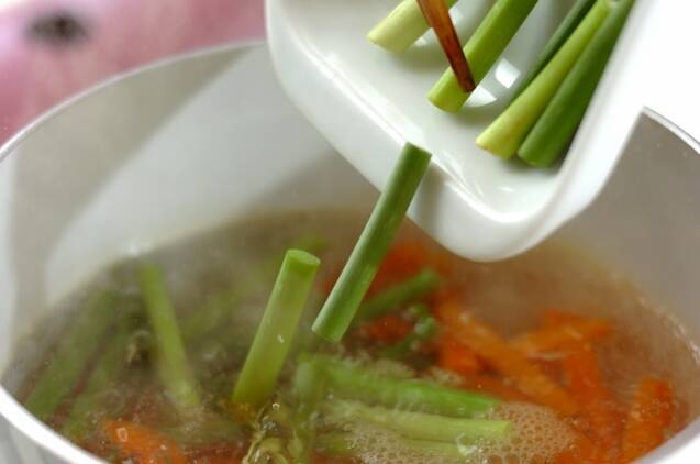 ニンジンと水を入れ、中火にかける。沸騰したらニンニクの芽を加え、2~3分ゆでてザルに上げる。