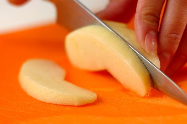 リンゴは4つのくし切りにして皮をむき、幅7~8mmに切って小鍋に入れ、砂糖、白ワインを加え、砂糖が溶けるまで混ぜ合わせる。
