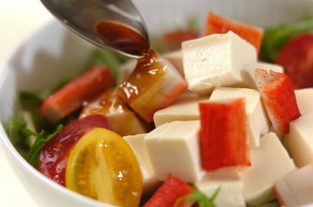 器に水菜、絹ごし豆腐、プチトマト、カニ風味カマボコを盛り合わせ、<ドレッシング>をかける。