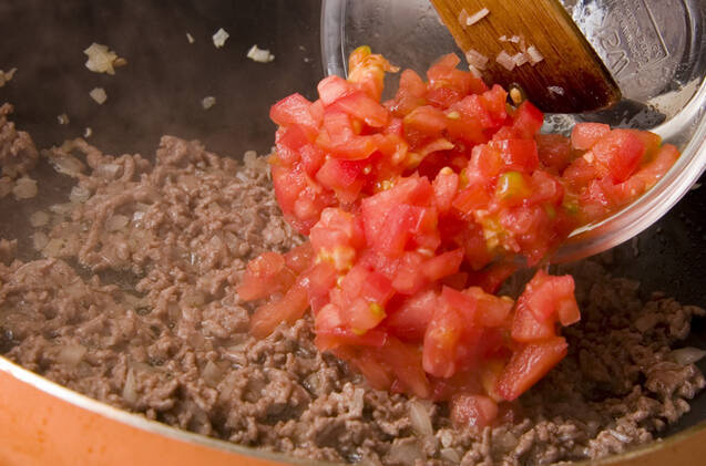 玉ネギ、ニンニク、トマト、<調味料>の生バジルはそれぞれ粗いみじん切りにする。フライパンにオリーブ油とニンニクを入れて弱火にかけ、香りがたてば玉ネギを加えて中火で炒める。しんなりすれば合いびき肉を加えて更に炒め、色が変わればトマトと<調味料>を加えてトロッとしたソース状になるまで3~5分煮詰める。