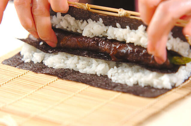 2/3幅の焼きのり4枚に、残ったすし飯の1/4量ずつを同様に広げ、切り落とした1/3幅の焼きのりを真ん中にのせる。2本は焼きのりの上にタラコとミツバをのせ、巻く。残り2本は焼きのりの上に牛肉巻きをのせて巻く。