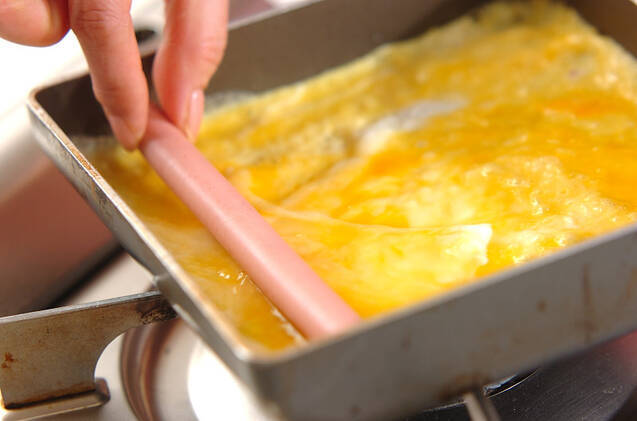 <棒卵焼き>を焼く。卵焼き器に薄く分量外のサラダ油をひいて熱し、卵液の1/2量を流し入れて全体に広げる。向こう側にウインナーソーセージをのせて手前に向かってクルクル巻く。あれば巻きすに巻いて形を整える。2本作る。