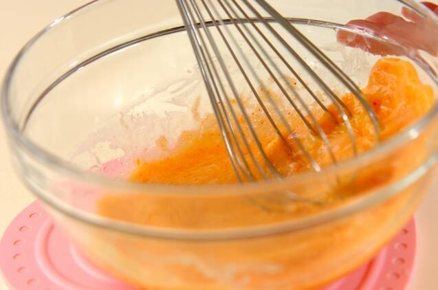 大きめのボウルで<卵液>の材料と明太子を混ぜ合わせる。