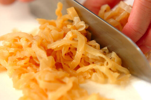 塩クラゲはサッと水洗いして塩を落とし、食べやすい大きさに切る。さらにたっぷりの水に10~15分つけて塩気を抜き、水気を絞る。