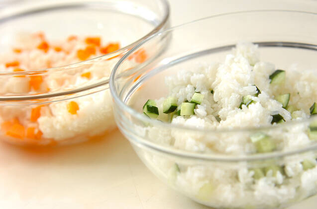 (1)のご飯を2等分し、キュウリとオレンジパプリカをそれぞれ加えて混ぜ合わせる。