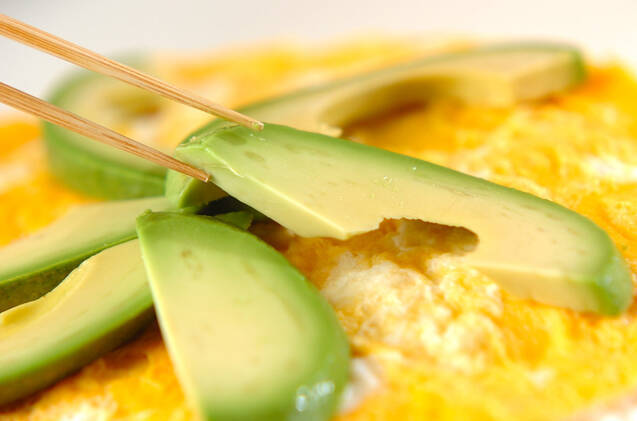 ケーキ型にオレンジパプリカを混ぜたご飯を敷き詰め、その上に水煮コーンを散らし、さらにキュウリを混ぜ合わせたご飯をのせ、上からしゃもじでしっかり押さえて型からはずす。さらに<薄焼き卵>、スモークサーモン、アボカド、カッテージチーズ、レモンを盛り付ける。