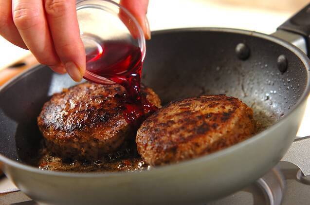 フライパンに新たに分量外のサラダ油小さじ1を熱し、ハンバーグの両面を焼く。赤ワインを入れ、フライパンに蓋をして4分程蒸し焼きにする。中まで火が通ったら取り出す。