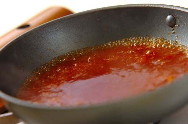 (2)のフライパンを軽く拭き、<タレ>の材料を全て入れて加熱する。