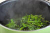 鍋に水、ショウガ汁、酒を入れて火にかける。煮たったら豚肉を広げながら入れ、アクを取る。