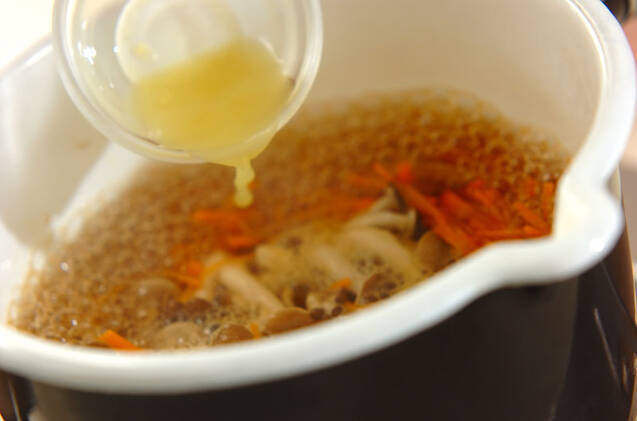 <あん>の鍋にニンジン、玉ネギを加えて強火で熱し、煮たったらシメジを加える。シメジがしんなりしたらショウガ汁を加え、<水溶き片栗>をまわし入れ、トロミがついたら火を止める。