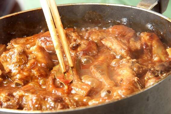2の煮汁が少なくなってくれば弱火にしてさらに10分、裏返しながら煮詰め、ほとんど煮汁がなくなれば火を止める。