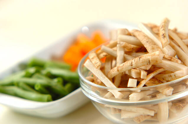 新ゴボウはタワシでこすりながら流水で洗い、長さ4~5cmの棒状に切る。