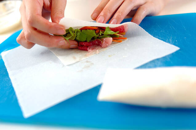 手前を巻き込み、左右を折り、手前からクルクル巻き、巻き終わりは<小麦粉のり>で留める。