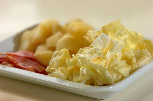 キャベツはザク切りにする。ジャガイモは皮をむいてラップに包み、電子レンジで4~5分加熱し、ひとくち大に切る。ベーコンは1cm幅に切る。