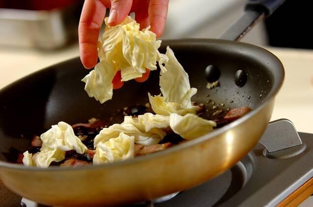 フライパンにオリーブ油とニンニクを入れ、弱火で熱し、香りが出てきたらベーコン、ブラックオリーブ、アンチョビを加え中火で炒め、さらにキャベツを加え炒める。
