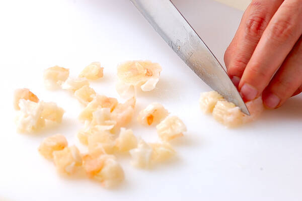 冷凍シューマイは電子レンジで加熱してもどし、細かく刻む。