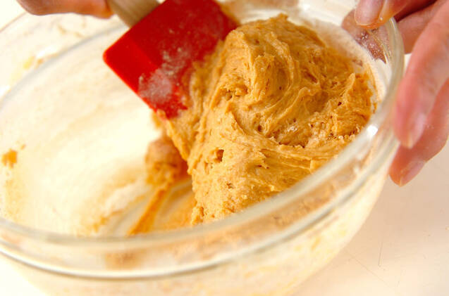 合わせて振るった薄力粉ときな粉を2~3回に分けて加え、泡立て器からゴムベラに変えて、粉っぽさがなくなる程度にサックリ混ぜる。