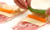 豚ロース肉を少し重ねて2枚ずつ並べ、塩コショウ、<衣>の小麦粉を薄く振り、スライスチーズを重ねる。水煮タケノコ、ニンジン、グリーンアスパラをのせ、しょうゆ少々をかけ、豚肉で巻き、巻き終わりをしっかり押さえる。