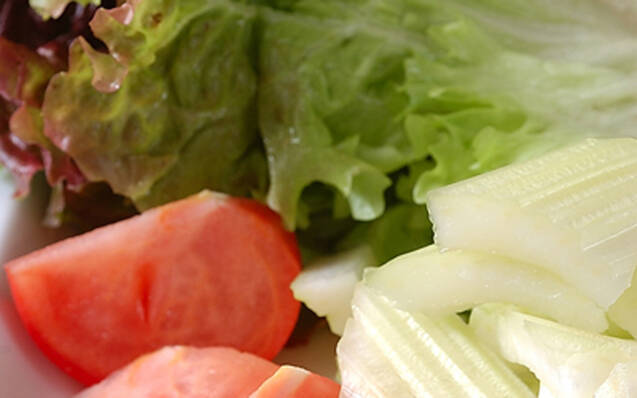 サニーレタスはきれいに水洗いして水気を切る。トマトは、半分に切り、セロリは筋を引いて、ひとくち大の乱切りにする。