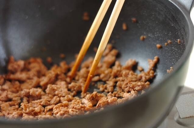 ナスから液体が出たら火を止めてナスをいったん取り出し、分量外の塩を振る。フライパンを再び中火にかけ、豚ひき肉をそぼろ状に炒める。