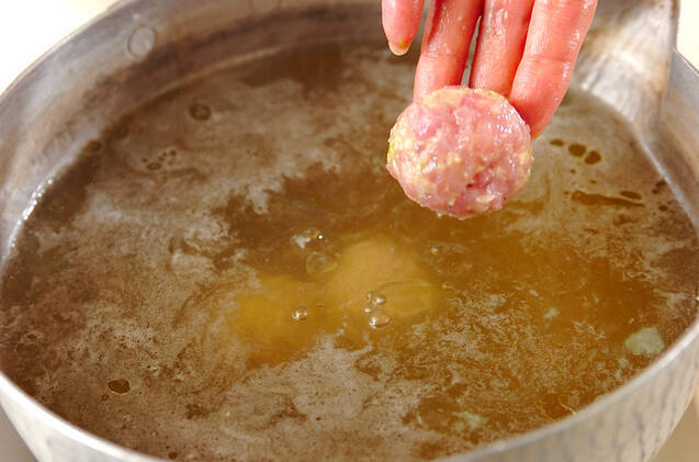 鍋に<鶏ガラスープ>と<調味料>を合わせて煮立たせ、1の<豚もも団子>を丸めながらスープに入れ、団子に火が通って浮いてきたらいったん取り出す。スープはキッチンペーパーでこす。