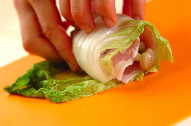 白菜の芯の部分に切り込みを入れ、豚バラ肉をのせる。塩コショウを全体に振り、シメジを置いてしっかりと巻き、つま楊枝で巻き終わりを閉じる。
